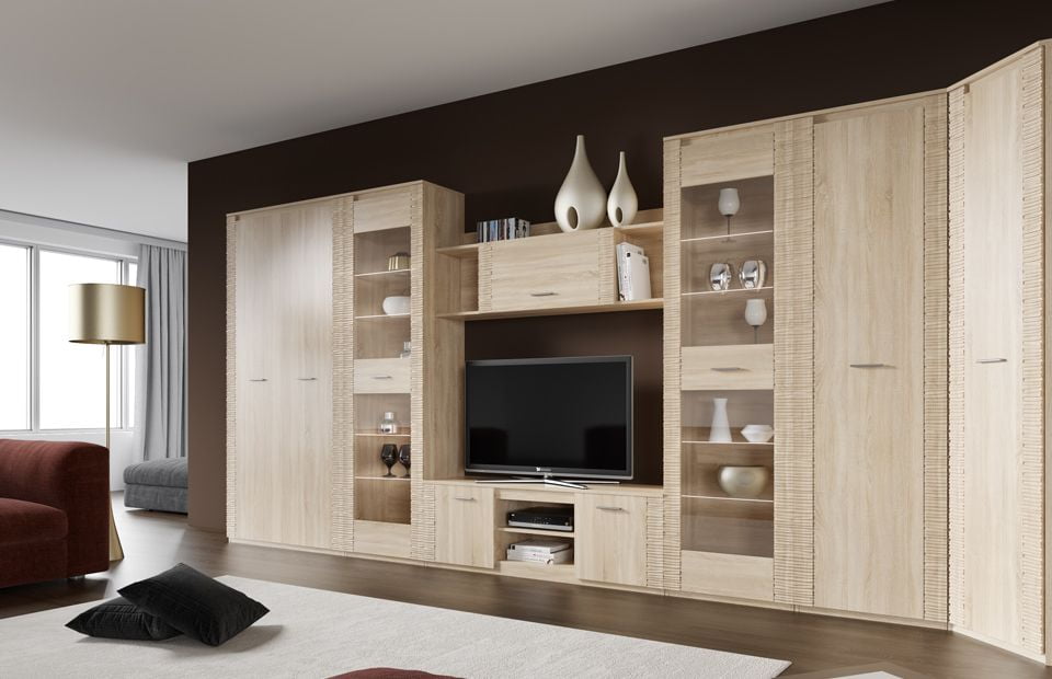 Дополнительно к основным модулям гостиной «Элана» рекомендуется приобрести полку «Лаго», один из вариантов журнальных столиков, а также добавить романтики в обычный вечер с помощью специальной светодиодной подсветки, которая может быть расположена в стеклянных полках.
