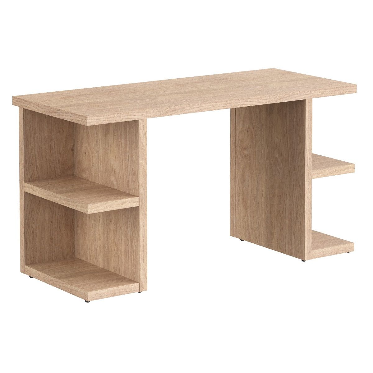 Массивный стол оригинальной конструкции. Толщина всех элементов - 38 мм - придает облику стола солидность и основательность, а открытые полки с двух сторон позволяют хранить бумаги, компакт-диски и аксессуары.