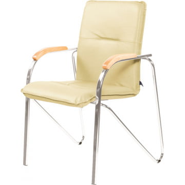 Конференц-стул Samba подходит для конференц-залов, для приема посетителей в офисе, для дома. Обит искусственной кожей бежевого цвета. Каркас выполнен из металла серебристого цвета, оснащен накладками для сохранности напольного покрытия. На подлокотниках - деревянные вставки цвета бук. Максимальная статическая нагрузка - 100 кг.