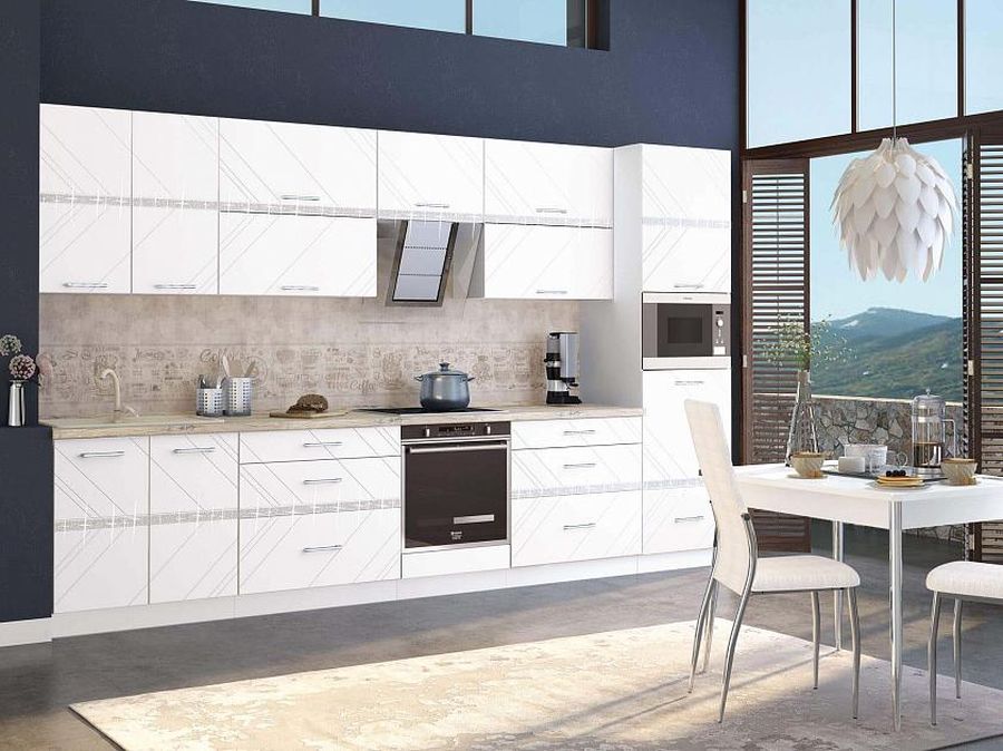 Белая глянцевая кухня отличается совершенно особенным лоском, делает помещение эффектным, стильным и визуально расширяет его границы. Привычная строгая геометрия кухонного фасада дополнена нежным 3D-декором в серебре. Кухня «Бьянка» – это воплощение чистоты и элегантности в Вашем доме.