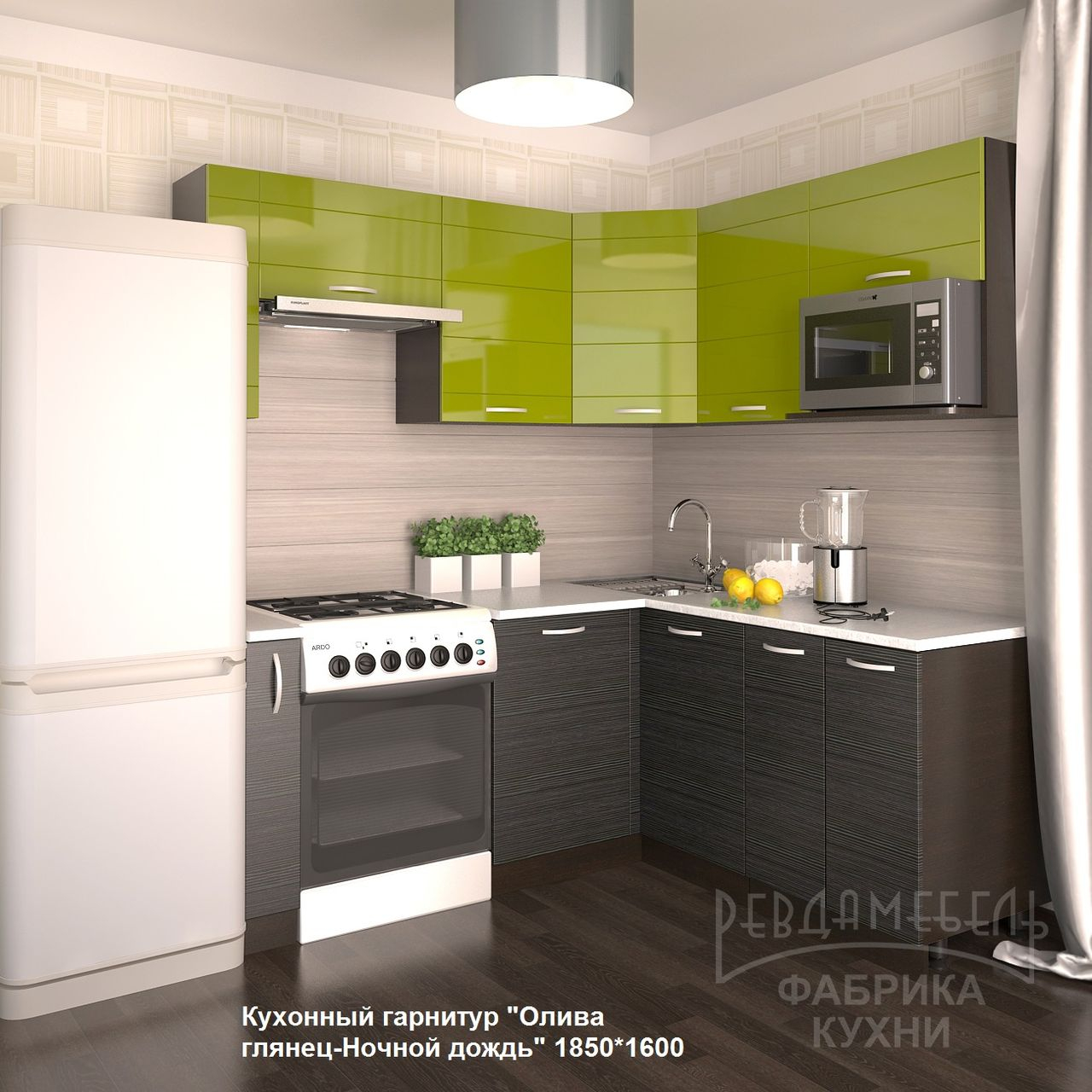 Дополнительная информация: размеры: 1850*1600 мм, возможна установка накладной мойки шириной 600*600 мм; посудосушитель - эмаль, шириной 600 мм; толщина столешницы 28 мм; имеются все необходимые отверстия под петли, ручки; поставляется в разобранном виде, инструкция в комплекте. Материал фасада МДФ в пленке ПВХ верх - Олива глянец, низ -Ночной дождь, короб —венге, цвет столешницы (постформинг) —Бриллиант Белый, ручка — скоба металлик.