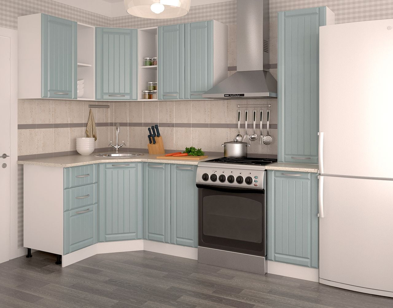 Дополнительная информация: размеры: 1250*1850 мм, возможна установка накладной мойки шириной 600*600 мм; посудосушитель - эмаль, шириной 600 мм; толщина столешницы 28 мм; имеются все необходимые отверстия под петли, ручки; поставляется в разобранном виде, инструкция в комплекте. Материал фасада МДФ в пленке ПВХ цвет: тополь скай, короб - белый, цвет столешницы (постформинг) — Сахара, ручка - скоба металлик.
