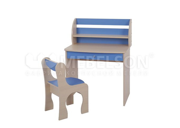 В нем есть стол с полкой для карандашей, выдвижным ящиком и замечательный стульчик в  едином стиле.