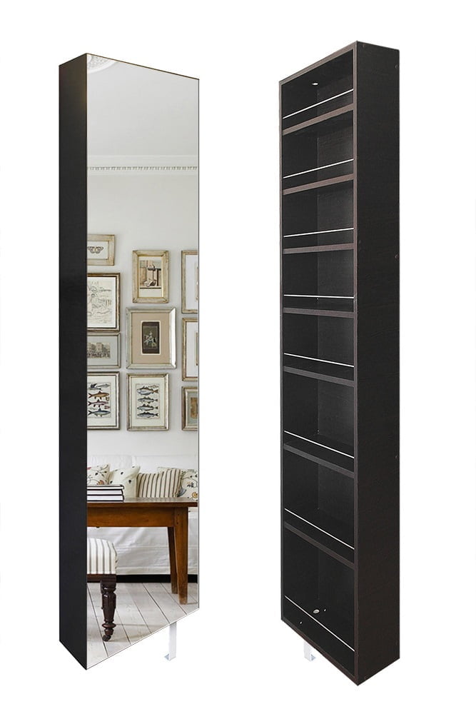 Поворотный шкаф Драйв Шелф – это огромное зеркало в полный рост, за которым скрываются 7 широких и глубоких полок с декоративными барьерами из нержавеющей стали. Прекрасное решение для прихожей, так как сочетает глубокие вместительные полки с широким полноразмерным зеркалом, которое можно повернуть под удобным углом.