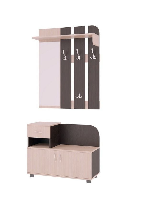 Компактный комплект мебели для прихожей поможет создать практичное и организованное место для хранения вещей и одежды. Благодаря открытой настенной вешалке вы сэкономите полезное пространство в прихожей, что особенно актуально для небольших помещений. Обувница (ВхШхГ): 694 х 800 х 334 мм;Вешалка (ВхШхГ): 1000 х 800 х 234 мм. Вместительная и практичная тумба для обуви имеет небольшой выдвижной ящик для различных мелочей, которые необходимо держать под рукой. Ниже располагается открытая ниша, где можно хранить, например перчатки или тапочки для гостей. Внизу расположен шкафчик для обуви, внутри него располагается полочка. Вешалка оснащена зеркалом, в которое полезно заглянуть перед выходом из дома. А также она имеет антресольную полку, где удобно хранить головные уборы и перчатки. Модель имеет три трехрожковых крючка для верхней одежды и один крючок для сумок. Изделие выполнено из ЛДСП толщиной 16 мм. Торцевые части деталей обработаны кромкой ПВХ толщиной 0,4 и 1 мм.