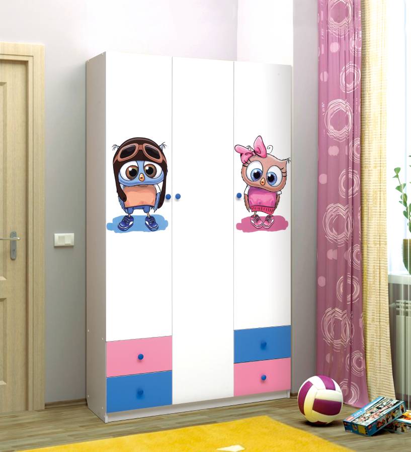 Шкаф 3-х дверный с ящиками, зеркалом и фотопечатью Совята 3.1 Белый/Ярко-розовый/Синий_204960