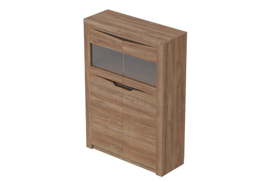 Двухдверный шкаф-витрина Соренто отлично впишется в интерьер практически любой современной гостиной, прихожей или кабинета. Визуально он кажется сделанным из массивных дубовых досок, оригинальности его дизайну придают дверцы с необычными ручками и стеклянной частью. Верхняя полка-витрина идет на всю ширину шкафа. На ней хорошо будут смотреться декоративные элементы, букинистические редкости или чайный сервиз. Закрытая часть состоит из трех вместительных полок, разделенных перегородкой пополам.