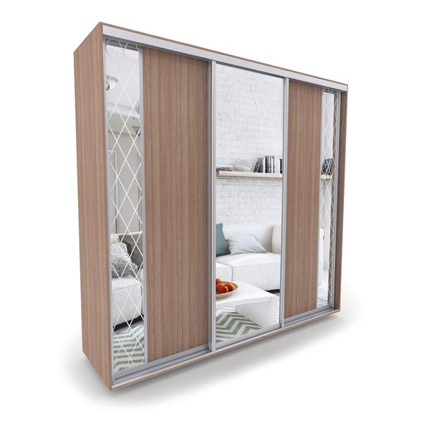 Двери купе выполнены в комбинации ЛДСП 10мм в цвет корпуса шкафа и зеркальной вставки с пескоструйной обработкой. Центральная дверь - зеркальная. Рисунок обработки "ромбы" фон зеркальный, рисунок – матовый. Высококачественный толстостенный алюминиевый профиль цвета хром матовый.