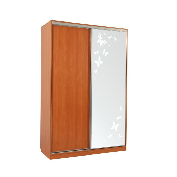 Фасады дверей выполнены из ЛДСП с вставкой из зеркала с матированным рисунком «Бабочки». Рисунок износостойкий, следы на нем не остаются. Зеркало безопасно, выполнено по технологии триплекс.