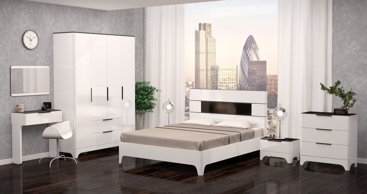 Спальня "Танго" выполнена в белом глянцевом декоре, в современном минималистическом стиле. В выдвижных ящиках используются шариковые направляющие полного выдвижения. Исполнение шкафов для одежды с зеркалом или без. В шкафу для одежды 4-х дв. установлена система складных фасадов. Кровати комплектуются встроенными латами. Комплект декоративных столешниц возможно приобрести опцией, крепление на двухсторонний скотч по месту.