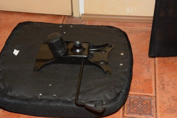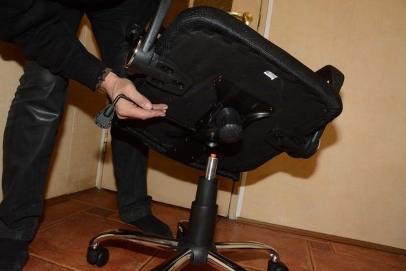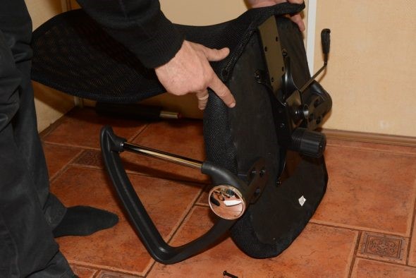 Теперь переходим к креплению механизма, удерживающего спинку. Удобнее всего будет положить сиденье на край стола – так, чтобы задняя часть чуть-чуть выступала за его пределы – тогда вам не придётся удерживать деталь на весу. Привинтите спинку – убедитесь, что большой регулировочный винт затянут в соответствии с инструкцией.