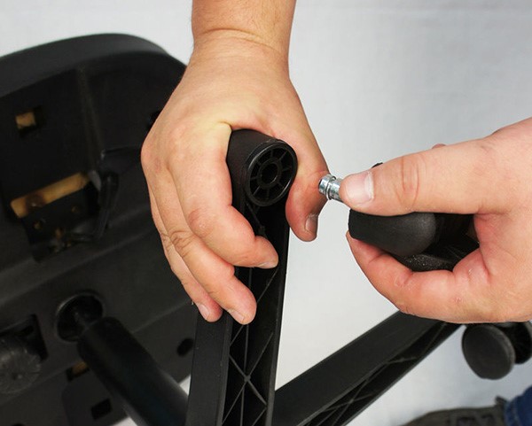 Переверните крестовину и положите её на ровную поверхность (лучше всего на пол, но и стол вполне подойдёт). Возьмите ролик (колёсико), вставьте его шток в одно из отверстий крестовины и надавите до щелчка. Повторите эти действия для каждого ролика.
