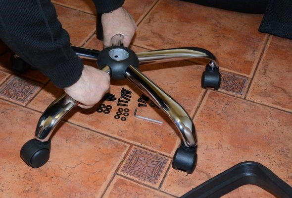Как правило, собирать офисное кресло начинают снизу. Первый шаг – установка роликов в крестовину: