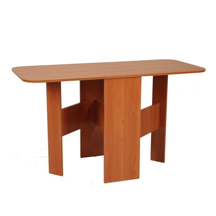 Компактный стол-книжка. Такое решение отлично подходит для небольших помещений. В сложенном виде длина стола всего 292 мм; длина каждого «крыла» 504 мм. Общая длина стола в разложенном виде 1306 мм. За таким столом удобно могут разместиться 6 человек. Максимальная нагрузка на стол составляет 50 кг. Изделие выполнено из ЛДСП первого сорта толщиной 16 мм. Края отделаны кантом ПВХ 0. 4 и 2 мм.