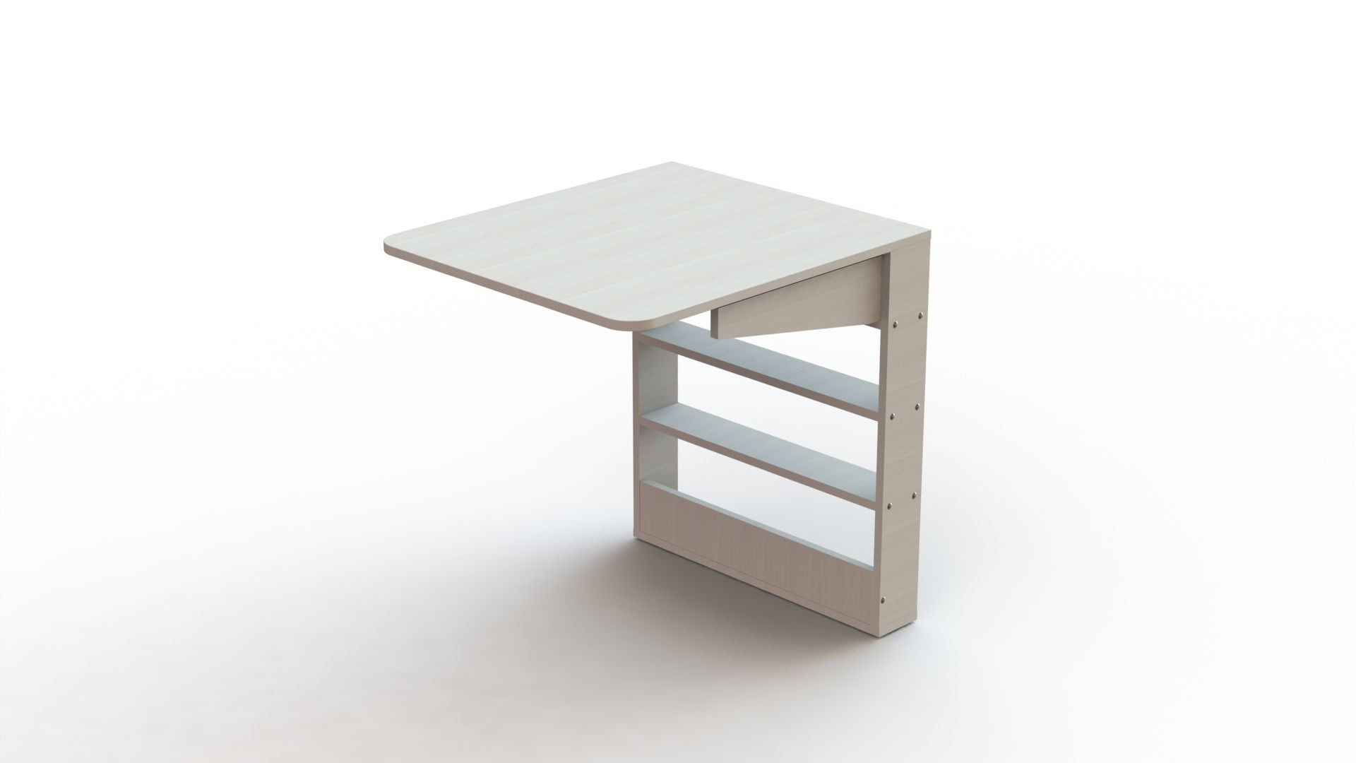 Подходит для малогабаритных помещений будь то кухня, лоджия или детская. Крепится стол к стене 2-мя угловыми навесами. Обратите внимание, что стена должна быть крепкой для крепления. Не смотря на свои компактные размеры, конструкция стола продумана, так что стол очень устойчив и надежен. Внутри стола расположены полочки для хранения.