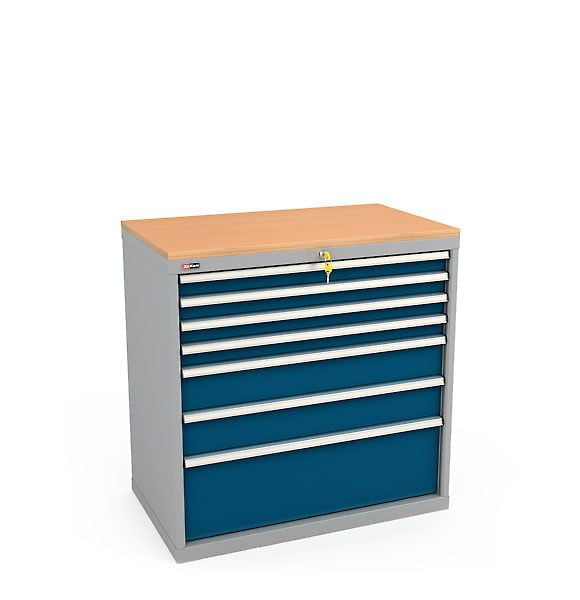 Семь выдвижных ящиков тумбы высотой 75 мм, 150 мм, 300 мм оснащены общим центральным замком EURO-LOCKS (Германия, 2000 комбинаций).